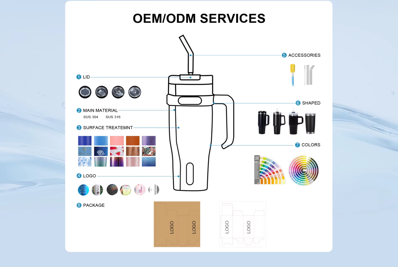 Our main products include various types of water bottles, tumbler cups, coffee mugs, protein shakers as well as accessories and so on.